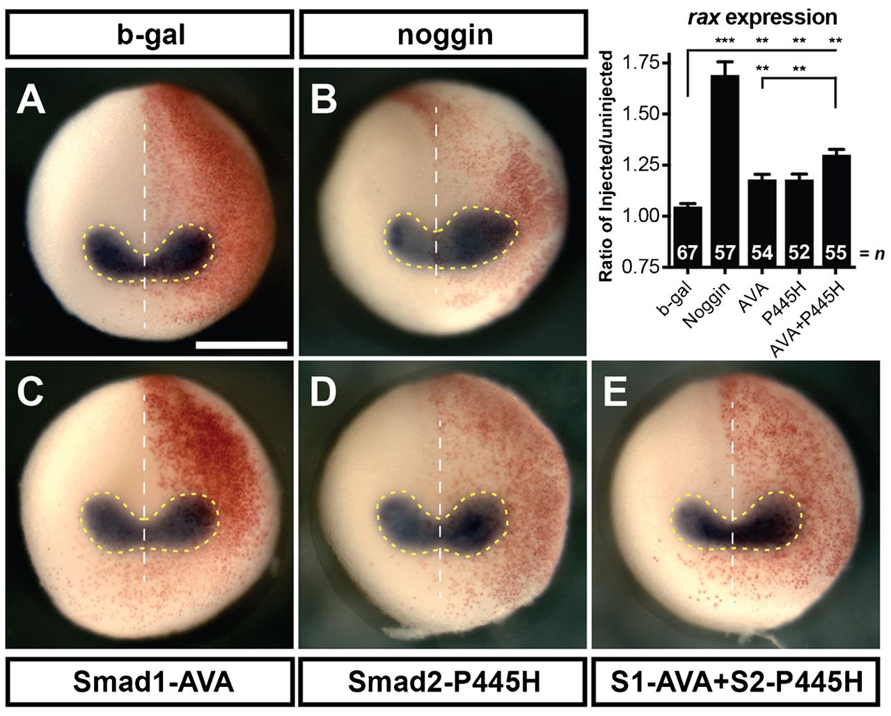 Fig. 4. Injection of Smad1-AVA (S1-AVA) and Smad2-P445H (S2-P445H) act additively to cause expansion of eye field.
