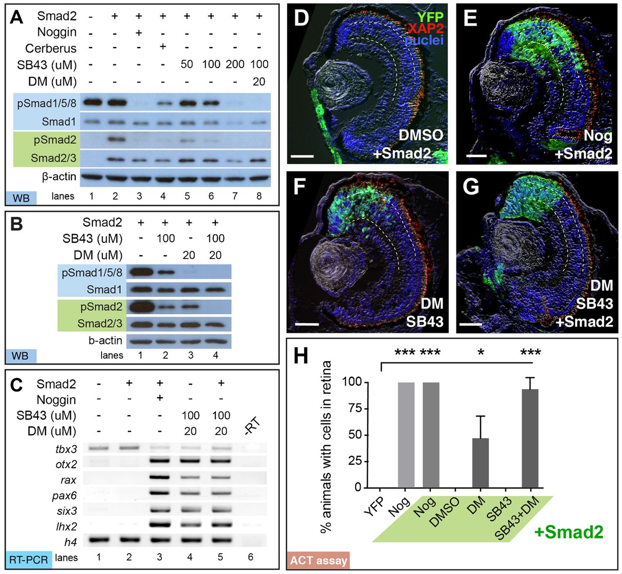 µM DM (SB43+DM) mimics Noggin's ability to suppress pSmad1/5/8 and pSmad2, as determined by western blot. (B) Suppression of both pSmad1/5/8 and pSmad2 is only complete with treatment of both SB43+DM. Smad1, Smad2, and β-actin served as loading controls. (C) RT-PCR analysis of animal caps shows that Noggin or SB43+DM±Smad2 induces expression of rax, pax6, six3, and otx2, while repressing tbx3. Histone H4 (h4) was used as a loading control. (DâH) DM+SB43±Smad2 treatment mimics the retinal integration efficiency of Noggin. (D) Smad2-injected cells treated with DMSO remain in the skin, while (E) Nog+Smad2 injected cells form retina in all animals. (F) SB43+DM treatment alone and (G) with Smad2 direct pluripotent cells to the retina. Scale bar, 50 µm. Dashed lines lie on outer and inner plexiform layers. (H) Quantification of ACT assay results shows the synergistic effect of adding DM and SB43 to generate retina (Nâ=â3). Green, YFP; red, rod photoreceptor marker, XAP2; blue, DAPI staining. Error bars â=â ±s.e.m.; **p<0.01; ***p<0.001