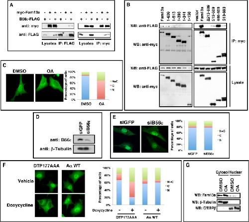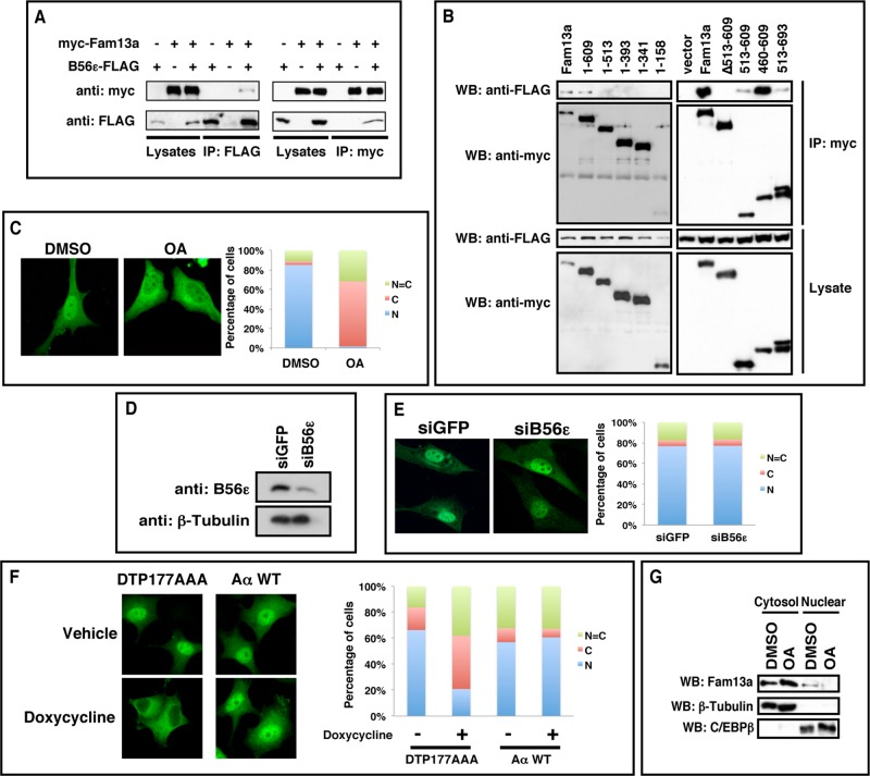 FIGURE 1:. B56-containing PP2As regulate nuclear localization of Fam13a. (A) Coimmunoprecipitation (CoIP) showing the interaction between FAM13A and B56ε. B56ε-FLAG and myc-FAM13A were expressed in HEK293T cells alone or in combination. Cells were harvested and subjected to CoIP with an anti-FLAG antibody (left) or an anti-myc antibody (right). (B) Western blot showing that FLAG-B56ε coimmunoprecipitated with full-length Fam13a and 1–609 but not other Fam13a deletion constructs (1–513, 1–393, 1–341, 1–158, and ∆513x609). In addition, FLAG-B56ε strongly interacted with 460–609 but only very weakly with 513–609 and 513–693. (C) Immunofluorescence images showing the nuclear localization of Fam13a in control (DMSO) cells and cytoplasmic localization of Fam13a in OA-treated cells. (D) Western blot showing knockdown of endogenous B56ε by a siRNA against B56ε (siB56ε). (E) Immunofluorescence images showing the nuclear localization of Fam13a in control (siGFP) and B56ε knockdown (siB56ε) cells. (F) Immunofluorescence images showing subcellular localization of wild-type Fam13a in vehicle or doxycycline-treated Aα exchange cells. Wild-type Fam13a was nuclear in vehicle-treated DTP177AAA and AαWT cells. Doxycycline treatment induced cytoplasmic sequestration of Fam13a in DTP177AAA cells but not in AαWT cells. Shown in C, E, and F are representative staining patterns. The percentage of cells displaying nuclear (N), cytoplasmic (C), or even distribution between nucleus and cytoplasm (N = C) are graphed. At least 100 cells from each sample were scored in each experiment. (G) Fractionation of control (DMSO-treated) and OA-treated A549 cells. Endogenous Fam13a protein in nuclear and cytosolic fractions was analyzed by Western blot. β-Tubulin and C/EBPβ served as marker for cytosolic and nuclear fractions, respectively. |