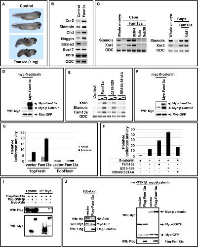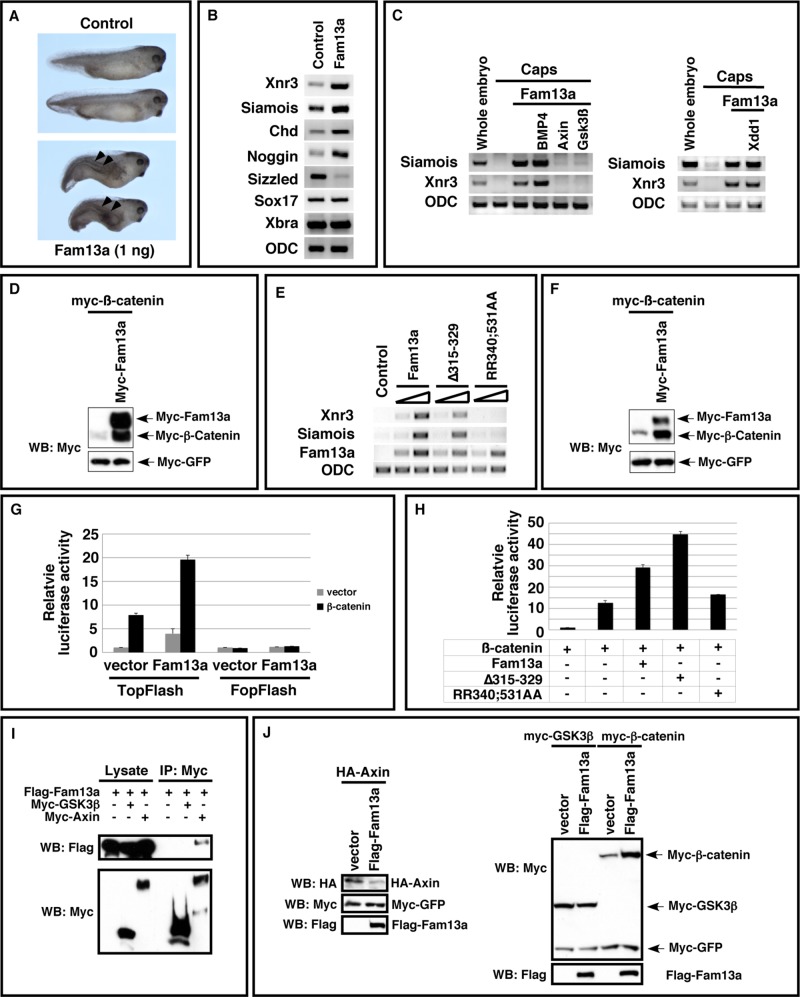 FIGURE 7:. Activation of Wnt signaling by Fam13a. (A) Morphology of uninjected and Fam13a RNA (1 ng)âinjected Xenopus embryos at the tadpole stage. Embryos injected with Fam13a developed partial secondary axes (arrowheads). (B) Expression of siamois, Xnr3, chordin, noggin, sizzled, sox17, and Xbra in control and Fam13a-injected embryos. Embryos were harvested at the early gastrula stage. (C) Epistasis analysis showing that the expression of siamois and Xnr3 in Fam13a-overexpressed animal caps was blocked by coexpression of axin or GSK3Ã. (D) Western blot showing that overexpression of Fam13a increased the expression of mycâβ-catenin in Xenopus embryos. At the two-cell stage, embryos were injected with a mixture of mycâβ-catenin (100 pg) and myc-GFP (50 pg) RNAs or a mixture of mycâβ-catenin, myc-GFP, and myc-Fam13a (1 ng). Embryos were harvested at stage 9. (E) RT-PCR, showing the expression of siamois and Xnr3 in Fam13a-, â315â329â, or RR340;531AA-overexpressed animal caps. As a control, the levels of injected Fam13a, â315-329, and RR340;531AA RNAs were monitored. (F) Western blot, showing that overexpression of Fam13a increased the expression of mycâβ-catenin in A549 cells. (G) Dual-luciferase assays, showing that overexpression of Fam13a activated TOPFlash and enhanced the activity of β-catenin in A549 cells. FOPFlash, which contains mutations in the TCF binding sites, was included as a negative control. Firefly luciferase activity was normalized to the activity of Renilla luciferase (TK-RL). (H) Overexpression of Fam13a and â315â329, but not RR340;531, enhanced the activity of β-catenin in the TOPFlash luciferase assay in A549 cells. Firefly luciferase activity was normalized to the activity of Renilla luciferase. (I) Western blot, showing coimmunoprecipitation of Flag-Fam13a and myc-axin. Of note, we did not detect any interaction between Flag-Fam13a and myc-GSK3β. (J) Western blot showing that overexpression of Fam13a reduced the expression of HA-Axin in A549 cells. The expression level of myc-GSK3à was not altered by Fam13a overexpression. |