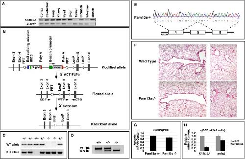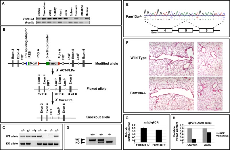 FIGURE 8:. Generation and analysis of Fam13a-knockout mice. (A) RT-PCR, showing the expression of FAM13A in adult mouse tissues. (B) Schematic diagram showing the knockout strategy. Arrowheads indicate primers used for genotyping. KO-F and GT-B were used to detect the knockout allele (KO). WT-F and GT-B were used to detect the wild-type allele (WT). (C) Genotyping PCR showing the genotype of offspring from intercrossing between Fam13a+/â mice. (D) RT-PCR, showing the expression of Fam13a in wild-type, heterozygous, and knockout animals. (E) Sequence of the PCR product amplified from a Fam13aâ/â-knockout animal, showing deletion of exon 5. (F) Histological analysis of the large airways (left) and alveoli (right) in a wild-type mouse and a FAM13A-knockout mouse. (G) Representative real-time RT-PCR result, showing the levels of axin2 mRNA in control and Fam13aâ/â lungs. (H) Representative real-time RT-PCR result, showing that knockdown of Fam13a reduced the level of axin2 mRNA in A549 cells. |
