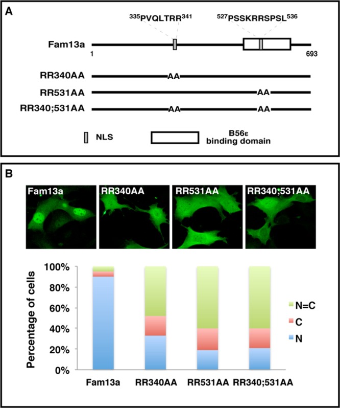 FIGURE 2:. Identification of NLSs in Fam13a. (A) Schematic diagram of wild-type Fam13a and NLS mutants (RR340AA, RR531AA, and RR340;531AA). (B) Representative immunofluorescence images showing the nuclear localization of wild-type Fam13a and mislocalization of NLS mutants in NIH3T3 cells. Bar graphs show percentage of cells that exhibit nuclear, cytoplasmic, or homogeneous subcellular distribution. R, arginine; A, alanine. |
