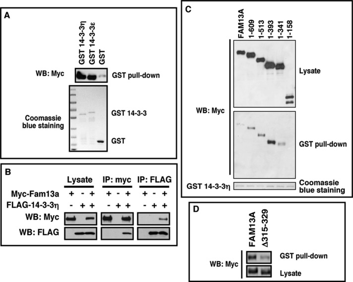 FIGURE 3:. Interaction between Fam13a and 14-3-3. (A) GST pull down, showing that Fam13a interacted with bacterially expressed GST–14-3-3η and GST–14-3-3ε but not GST. (B) Western blot, showing coimmunoprecipitation of myc-Fam13a and FLAG–14-3-3η. FLAG–14-3-3η was detected when myc-Fam13a was immunoprecipitated (middle). Conversely, myc-Fam13a was detected when FLAG-14-3-3η was immunoprecipitated (right). (C) GST pull-down assay, showing that GST–14-3-3 interacts with the full-length Fam13a and some Fam13a deletion constructs (1–609, 1–513, 1–393, and 1–341). GST-14-3-3 failed to pull down 1–158. (D) Western blot, showing that truncation of residues 315–329 decreased the binding between GST–14-3-3 and Fam13a. |