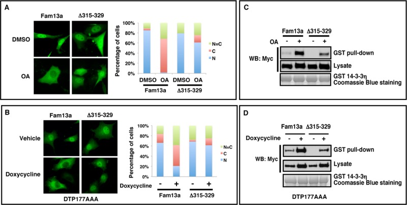 FIGURE 4:. The 14-3-3 binding domain is important for cytoplasmic sequestration of Fam13a in response to PP2A inhibition. (A) Representative immunofluorescence images, showing the subcellular distribution of Fam13a and Δ315–329 in control (DMSO) and OA-treated NIH3T3 cells. Fam13a and Δ315–329 were primarily nuclear in control (DMSO) NIH3T3 cells. OA treatment induced cytoplasmic localization of Fam13a. Δ315–329 remained nuclear in the majority of OA-treated cells. (B) Representative immunofluorescence images, showing subcellular distribution of Fam13a and Δ315–329 in control (vehicle-treated) and doxycycline-treated Aα exchange (DTP177AAA) cells. Fam13a and Δ315–329 were nuclear in vehicle-treated cells. After doxycycline treatment, Fam13a was mislocalized. Δ315–329 remained nuclear in the majority of treated cells. Bar graphs in A and B indicate the percentage of cells that exhibit nuclear, cytoplasmic, or homogeneous subcellular distribution. (C) The 14-3-3 binding motif (residues 315–329) is required for the effect of PP2A inhibition on binding between Fam13a and bacterially expressed GST–14-3-3η in a GST pull-down assay. Fam13a- and Δ315–329–expressing cells were treated with DMSO or OA. Cell lysates were used for the GST pull-down assay. Note that OA treatment significantly enhanced interaction between Fam13a and GST–14-3-3. Compared to wild-type Fam13a, Δ315-329 showed much weaker interaction with 14-3-3 after OA treatment. (D) The 14-3-3 binding motif (residues 315–329) is required for the effect of B56s knockdown on binding between Fam13a and GST–14-3-3 in a GST pull-down assay. Fam13a- and Δ315–329–expressing Aα exchange cells were treated with vehicle or doxycycline. Cell lysates were used in a GST pull-down assay. Doxycycline treatment significantly enhanced the interaction between Fam13a and 14-3-3. However, Δ315–329 showed weaker interaction with 14-3-3 compared with wild-type Fam13a after doxycycline treatment. |