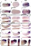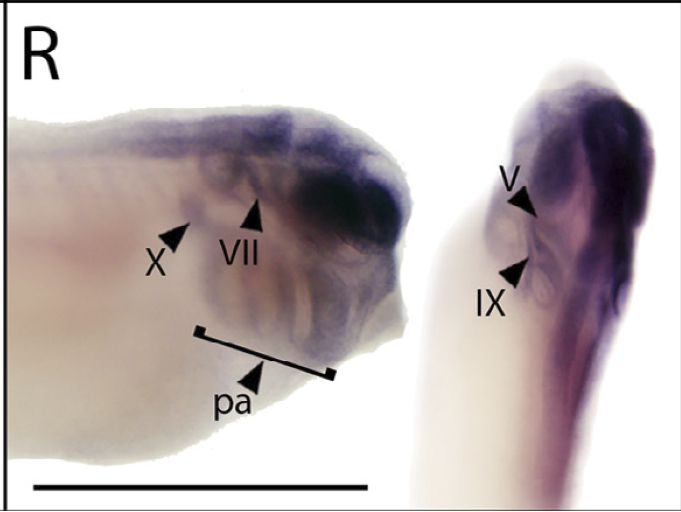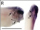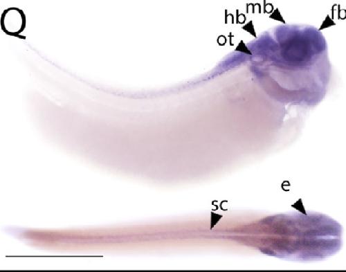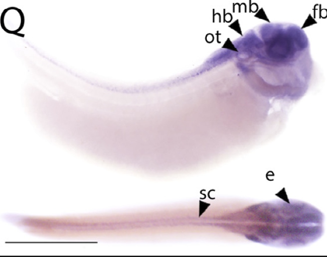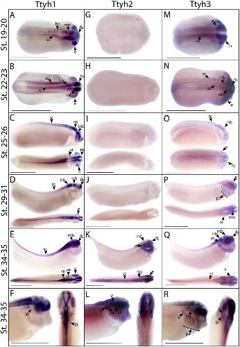 Fig.â1. Whole mount in situ hybridization showing spatial and temporal expression of tweety homologs in developing X. laevis embryos. Row 1 and 2: dorsal views. Rows 3, 4, 5: both lateral (top embryo, with dorsal side on top) and dorsal (bottom embryo) views. Anterior is oriented to the right for all embryos. Row 6: close up of anterior part of the embryo, with a lateral view (dorsal side on top) and a dorsal view (with anterior directed upwards). (A, G, M) Stages 19â20 (late neurula). (B, H, N) Stages 22â23 (early tailbud). (C, I, O) Stages 25â26 (mid-tailbud). (D, J, P) Stages 29â31 (late tailbud). (E, K, Q) Stages 34â35 (swimming tadpole). (F, L, R) Stages 34â35 (swimming tadpole, close up). (AâF) Ttyh1 expression. (GâL) Ttyh2 expression. (MâR) Ttyh3 expression. Arrowheads indicate regions of expression. (fb, forebrain; e, eye; hb, hindbrain; mb, midbrain; ot, otic vesicle; pa, pharyngeal arches; sc, spinal cord; nt, neural tube; so, somites; Roman numerals: cranial ganglia.) Scale barsâ=â1.0âmm.