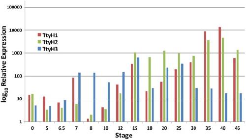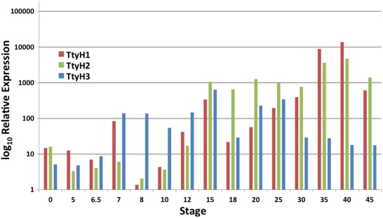 Fig. 3. qRT-PCR showing ttyh gene expression from single cell to stage 45. Stage 0 in the figure denotes unfertilized eggs. At each stage gene expression was quantitated using the δδCT method and corrected for expression of the control gene (Drosha). Relative expression is displayed log10 transformed.