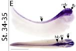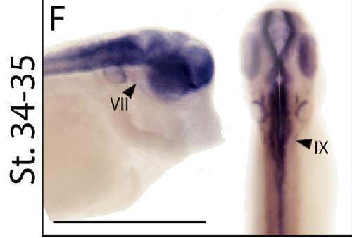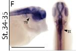 ttyh1 (tweety family member 1) gene expression in Xenopus laevis embryo, assayed via in situ hybridization, NF stage 34-35, lateral view, anterior right, dorsal up, (left) , and dorsal view (right).