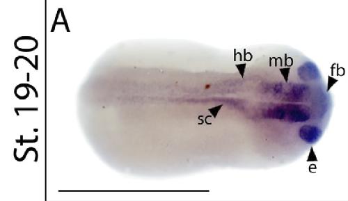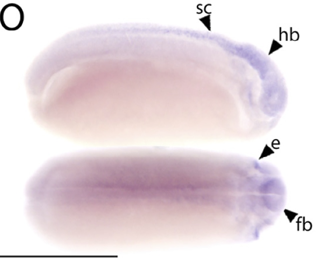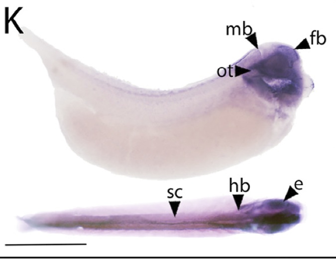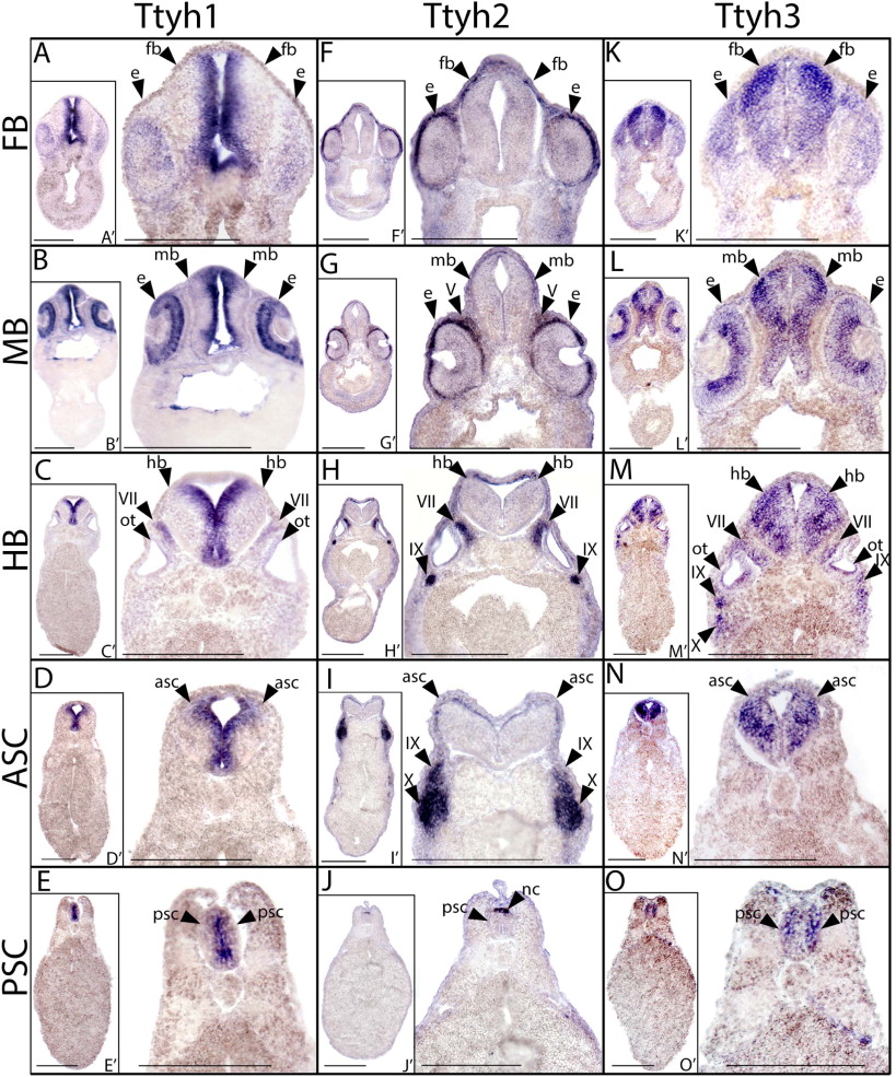 Fig. 2. Histological analysis of tweety homolog expression in X. laevis stages 35â37 (swimming tadpole) using whole-mount in situ hybridization. Transverse 18 μm sec- tions along the anteriorâposterior axis with dorsal to the top. (AâO) 10à magnification images focused on neural regions with signal. (Aâ²âOâ²) 4à magnification images to show to the absence of signal in other regions. (A, F, K) Sections showing forebrain. (B, G, L) Sections showing midbrain. (C, H, M) Sections showing hindbrain. (D, I, N) Sections showing anterior spinal cord. (E, J, O) Sections showing posterior spinal cord. (AâE) Ttyh1 expression. (FâJ) Ttyh2 expression. (KâO) Ttyh3 expression. Arrowheads indicate regions of expression. (asc, anterior spinal cord; mb, midbrain; hb, hindbrain; fb, forebrain; e, eye; nc, neural crest; ot, otic vesicle; psc, posterior spinal cord; sc, spinal cord; Roman numerals: cranial ganglia.) Scale bars = 0.25 mm.
