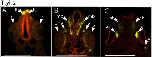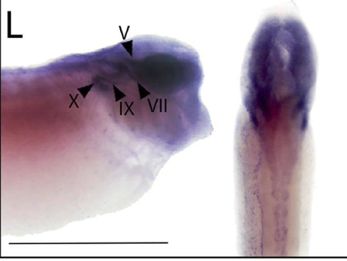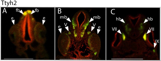 Fig.â4. Due to the concentrated expression of ttyh2 in the cranial ganglia, double fluorescent in situ hybridization was carried out to determine its co-localization with another known cranial ganglia marker. Histological analysis of tweety homolog 2 (ttyh2) (Cy3-tyramide) and xVGlut1 (FITC-tyramide) expression in X. laevis stage 35 (swimming tadpole) using whole-mount fluorescent in situ hybridization. Transverse 25âµm sections along the anteriorâposterior axis with dorsal to the top. (A) Section showing forebrain. (B) Section showing midbrain. (C) Section showing hindbrain. (mb, midbrain; hb, hindbrain; fb, forebrain; e, eye; Roman numerals: cranial ganglia.) Scale barsâ=â0.25âmm.