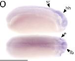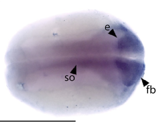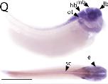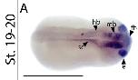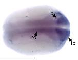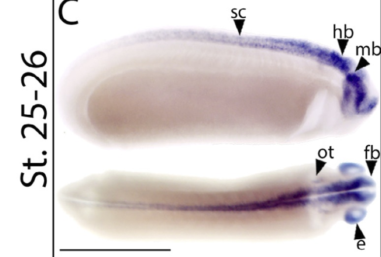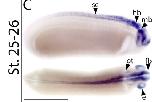 ttyh1 (tweety family member 1) gene expression in Xenopus laevis embryo, assayed via in situ hybridization, NF stage 25-26, lateral view, anterior right, dorsal up (above), and dorsal view (below).