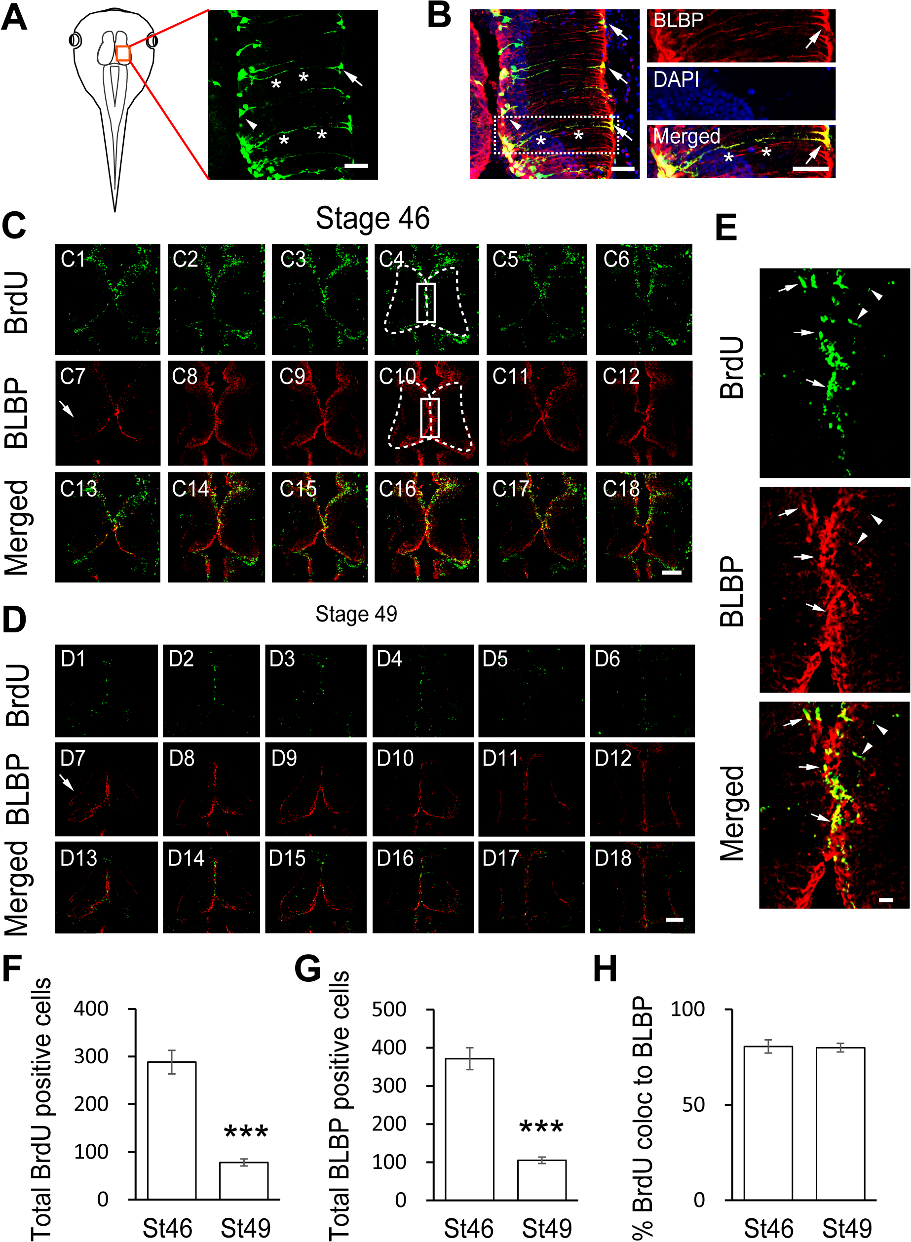 (A). A cartoon showing the tectum at stage 47. The right lobe of the brain was transfected with CMV::eGFP using method of unilateral brain electroporation. The eGFP-expressing cells within the tectum show a characteristic radial glial cell morphology with triangular cell bodies (arrow head), long processes (asterisk) and large end feet (arrow). Scale: 50 μm. (B). The majority of eGFP-expressing cells in the optic tectum are also BLBP-positive. Right panel: a higher magnification image of the right tectum, Scale: 50 μm. (C-D). Xenopus laevis were incubated with BrdU for 2 hours and co-labeled with anti-BrdU and anti-BLBP antibodies at stage 46 (C) and stage 49 (D), respectively. Six representative sections were shown for stage 46 (C1-C6: BrdU staining; C7-C12: BLBP staining and C13-C18: BrdU and BLBP merged) and stage 49 (D1-D6: BrdU staining; D7-D12: BLBP staining and D13-D18: BrdU and BLBP merged), respectively. Arrows indicate the end feet of RGs. Data represent the average cumulative cell counts for 8 sections per brain (Note: remaining figures show one representative section per condition). The shape of the tectal brain was outlined with a dotted line. The counting area was outlined with a white square (C4 and C10). (E). The zoom in images from the square area (C4, C10 and C16) was shown. Arrows indicate cells co-labeled with BrdU (green) and BLBP (red). Scale: 100 μm. (F-G). Quantification of BrdU- and BLBP-positive cells in whole-mount tecta showed decreases in the numbers of BrdU- and BLBP-labeling cells at stage 49 compared to stage 46 (BrdU: St 46, 288.3 ± 24.7, N = 3, St 49, 78.0 ± 7.4, N = 5; BLBP: St 46, 371.3 ± 28.4, N = 3, St 49, 105.2 ± 8.2, N = 5; ***p<0.001). (H). The majority of BrdU-labeling cells are colocalized to BLBP-positive cells at stage 46 and 49 (St 46: 80.6% ± 3.5%, N = 3, St 49: 80% ± 2.3%, N = 5, p = 0.72).