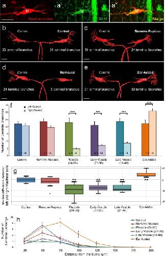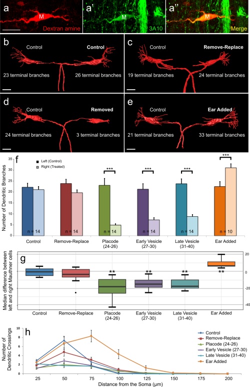 Figure 3. Dendritic development of Mauthner cells following ear manipulation. (a) Dextran amine dye labeling and (a′) 3A10 immunohistochemistry of a Mauthner cell (M) showing filling of dendrites by dextran amine dye. (a″) Merge of a and a′. (b) 3D reconstruction of a pair of Mauthner cells from a control embryo. (c) 3D reconstruction of a pair of Mauthner cells in which the right ear was removed and immediately replaced show little difference in the number of dendritic branches between Mauthner cells. (d) 3D reconstruction of a pair of Mauthner cells from an animal in which the right ear was removed at Stage 26 show a reduction in dendritic branching in the ipsilateral Mauthner cell. (e) 3D reconstruction of a pair of Mauthner cells from an animal in which an additional ear was transplanted rostral to the native ear at Stage 26 show an increase in dendritic branching in the ipsilateral Mauthner cell. (f) Number of dendritic branches following ear removal or ear addition. Dark shaded bars are left (control) Mauthner cells, light shaded bars are right (treated) Mauthner cells. ***, p < 0.001. (g) Median differences between left and right Mauthner cells following ear removal or ear addition. **represent significant difference from control, p < 0.005. (h) Sholl Analysis of the Mauthner cells on the right (treated) side in f. The number of dendritic branch crossings were counted at 25 µm intervals. Scale bar is 50 µm. Error bars are standard errors of the means.