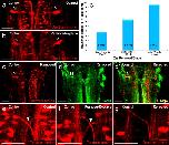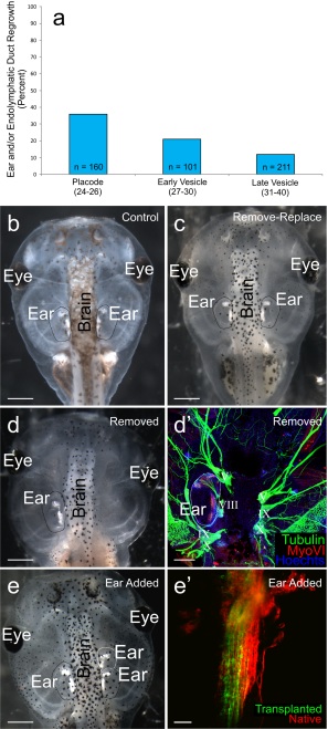 Figure 1. Success of ear removal. (a) Percentage of animals with any form of ear regrowth at each stage of ear removal. (b) Control X. laevis at Stage 46. (c) Embryo in which the right ear was removed and replaced. (d) Embryo in which the right ear was removed. (d′) Immunohistochemistry for acetylated tubulin showing cranial nerves (roman numerals) and myoVI showing the absence of the ear on the right side as indicated by the absence of hair cells. (e) Embryo in which an additional ear was added rostral to the native right ear. (e′) Lipophilic dye labeling showing sensory neuron projections from both the native (red) and transplanted (green) ears into the vestibular nucleus in the hindbrain. Native ears are circled in black and labeled, Ear. Transplanted ear is circled in white. Scale bar is 0.5 mm in b–d and f; 200 µm in e; 25 µm in g.