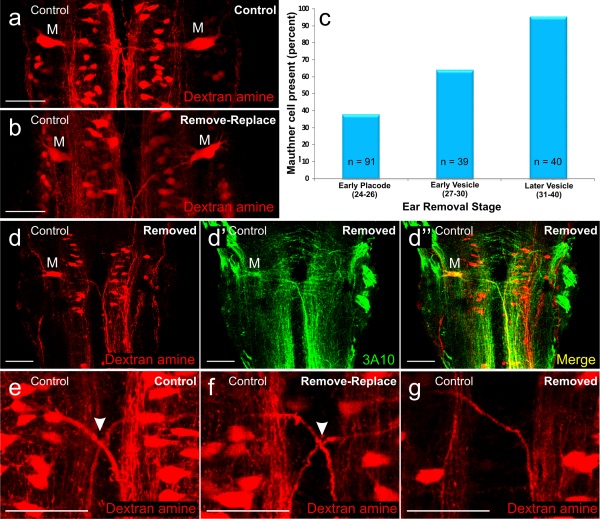 Figure 2. Mauthner cell survival. (a) Dextran amine dye-labeled Mauthner cells in a control animal. (b) Dextran amine dye-labeled Mauthner cells in an animal in which the right ear was removed and immediately replaced. (c) Percentage of Mauthner cells present on the right side at the different stages of ear removal. (d) Dextran amine dye-labeled and (d′) 3A10 antibody immunohistochemistry showing the absence of the ipsilateral Mauthner cell following the removal of the right ear at Stage 28. (d″) Merge of d and d′. (e) Higher magnification image showing bilateral Mauthner cell axon crossing in a control animal. (f) Higher magnification image showing bilateral Mauthner cell axon crossing in an animal in which the ear was removed and immediately replaced. (g) Higher magnification image showing only unilateral Mauthner cell axon crossing in an animal in which the right ear was removed at Stage 27. M, Mauthner cell; arrowheads indicate the crossing of two Mauthner cell axons. Scale bar is 50 µm.
