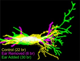 Figure 4. Comparison of Mauthner cell dendritic branching following ear manipulation. Overlay of three right Mauthner cells from a control animal (yellow), an animal in which the ear was removed (magenta), and an animal with an extra ear (green). The number of dendritic branches (indicated in parenthesis) for the three representative Mauthner cells is approximately equal to the mean number of dendritic branches for each group as revealed in Fig. 3.