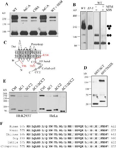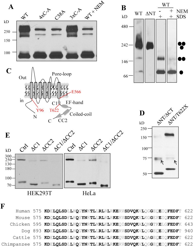 Figure 3. Identification of domain C1 of PKD2L1 critical for its trimerization.(A) WB detection of over-expressed Flag-tagged PKD2L1 WT, without or with 10â mM NEM treatment, or mutants 4ÃC-A (quadruple C38A, C60A, C70A and C74A mutations), C38A and 3ÃC-A (triple C60A, C70A and C74A mutations) under non-reducing condition. (B) WB analysis after BN-PAGE of Flag-tagged PKD2L1 WT and δNT over-expressed in HeLa cells. WT samples were prepared with or without 2.5% SDS, or with 2.5% SDS plus 10â mM NEM. Putative PKD2L1 monomer, dimer and trimer are indicated. (C) Schematic illustration of PKD2L1 membrane topology. TMs, pore-loop, C1, CC2, EF-hand, coiled-coil domains, and positions of residues Y96, E566 and T622 are indicated. (D) WB detection of Flag-tagged PKD2L1 mutants δNT/δCT (M1-Y96 and E566-S805 double deletion) and δNT/T622X (M1-Y96 and T622-S805 double deletion) over-expressed in HeLa cells under the non-reducing condition. Two unknown bands similar to one in Fig. 2F remained unaccounted for. (E) WB detection of over-expressed Flag-tagged PKD2L1 mutants in HEK or HeLa cells. All constructs were made from δNT. These included Ctrl (δNT), δC1 (C1, K575-T622, deletion from δNT), δCC2 (CC2, G699-W743, deletion from δNT), or δC1/δCC2 (C1 and CC2 double deletion from δN). (F) Amino acid sequence alignment of PKD2L1 C1 from indicated species. National Center for Biotechnology Information accession number for sequences used here are NP_057196 (human), NP_852087 (mouse), XP_426509 (chicken), XP_005637930 (dog), XP_002698535 (cattle), and XP_001168415 (chimpanzee). Identical residues among the species are indicated by black bold letters.