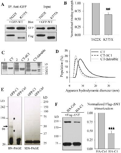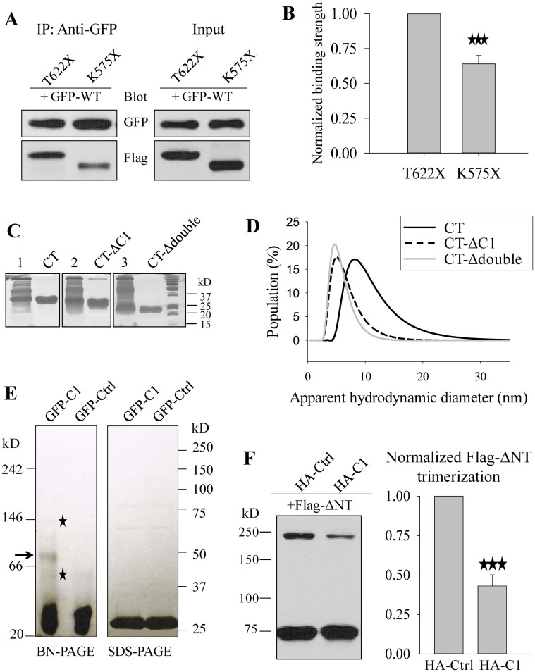 Figure 5. Further evidences for C1 involvement in trimerization.(A) Effect of C1 on the interaction between two PKD2L1 proteins assessed by co-IP. Left panel: representative data showing the interaction of GFP-PKD2L1 (GFP-WT) with Flag-T622X or Flag-K575X in HeLa cells. GFP-WT was first transfected, followed by transfection of T622X and K575X 12 hr later. Right panel: representative input data by WB showing the expression of WT, T622X and K575X. (B) Data from experiments in panel A were quantified, averaged, normalized, and then compared by paired t-test (***P ≤ 0.001, N = 3). (C) Coomassie blue staining of purified PKD2L1 C-terminus (CT, E566-S805), CT-ΔC1 (C1 deletion from CT), and CT-Δdouble (C1 and CC2 double deletion from CT) from E. coli. Data using crude lysates are shown on their left (lanes 1, 2 and 3). (D) Analysis of size distribution of purified CT, CT-ΔC1, and CT-Δdouble fragments by dynamic light scattering experiments. (E) Coomassie blue staining analysis of BN-PAGE or SDS-PAGE of purified protein GFP-C1 or GFP-Ctrl (human 4EBP1 M1-T50 fragment). Putative GFP-C1 trimer is indicated by an arrow on BN-PAGE. The faint bands below and above the putative trimer are indicated with stars. (F) Left panel: WB detection of over-expressed Flag-ΔNT with co-expression of HA-tagged blocking peptide C1 (HA-C1) or control peptide T622-E675 (HA-Ctrl) in HeLa cells under the non-reducing condition. 200 ng Flag-ΔNT plasmid and 1000 ng HA-C1 or HA-Ctrl plasmid were used in the co-transfection. Right panel: trimer bands were quantified, averaged, normalized, and compared by paired t-test (***P ≤ 0.001, N = 3).