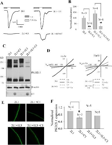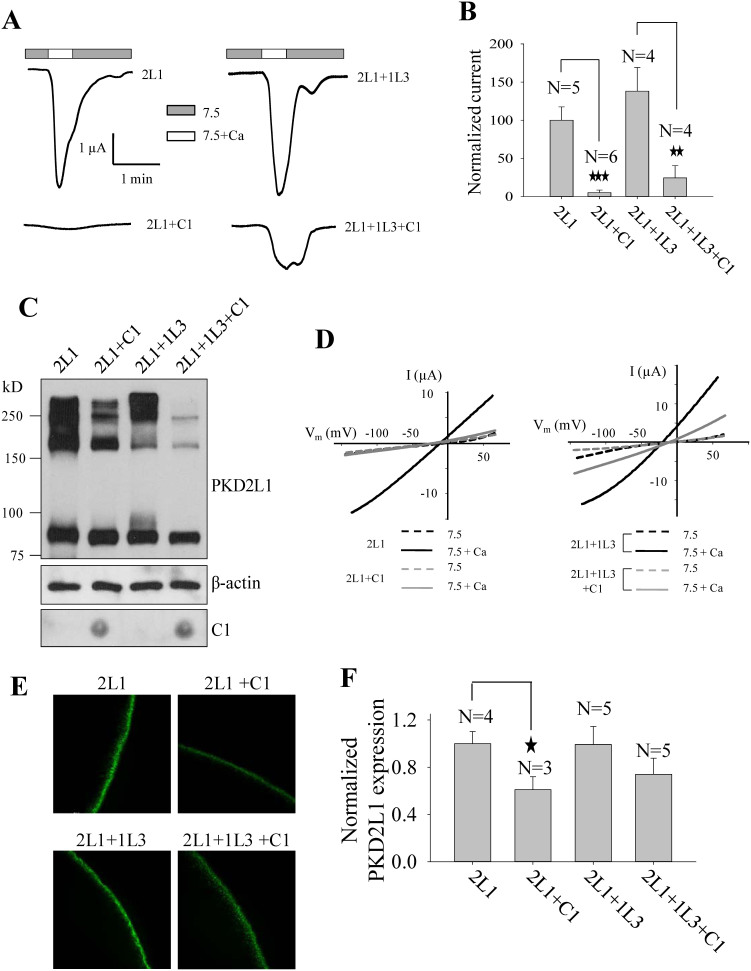 Figure 6. Effect of C1 on PKD2L1 trimerization and function.(A) Representative whole-cell current tracings from Xenopus oocytes expressing PKD2L1 (2L1) or PKD2L1/PKD1L3 (2L1+1L3), with or without C1 using the two-microelectrode voltage clamp technique under similar conditions as for Fig. 2. (B) Averaged currents elicited by extracellular 5 mM Ca2+ from oocytes expressing 2L1 or 2L1+1L3, with or without C1, and voltage clamped at −50 mV. Currents were averaged from different numbers of oocytes, as indicated, and normalized to that of WT PKD2L1 alone. (C) WB detection of PKD2L1 expression or dot blot detection of C1 expression in oocytes. (D) Representative current–voltage relationship curves obtained using a voltage ramp protocol, as indicated in Fig. 2C, before (7.5) and after (7.5+Ca) addition of 5 mM CaCl2. (E) Representative immunofluorescence data showing the oocyte plasma membrane expression of 2L1 and 2L1+1L3, with or without C1. (F) Surface expression was quantified and averaged from the indicated numbers of oocytes, and normalized to that of 2L1.