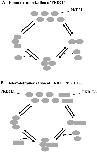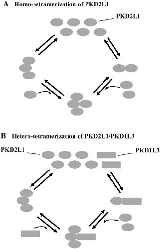 Figure 7. Model illustrating how a PKD2L1 homo- or heterotetramerer can be formed.(A) A PKD2L1 (oval) homotetramer can be formed either through first homotrimerization followed by recruitment of a fourth subunit to the trimer by dimerization or through first homodimerization followed by recruitment of two subunits to form a trimer with a subunit in the dimer. Of notes, 1) the illustration is only to indicate trimeric and dimeric binding and does not intend to show how the pore region is organized; and 2) the drawn trimer does not intend to mean that there are two points of contact. (B) A PKD2L1 heterotetramer can be formed with a PKD1 homologue (square), eg, PKD1L3 or PKD1L1, through first trimerization of PKD2L1 and then recruitment of a PKD1 homologue, or reversely, through first heterodimerization between PKD2L1 and a PKD1 homologue, followed by recruitment of two PKD2L1 subunits to form a trimer with the existing PKD2L1 subunit.