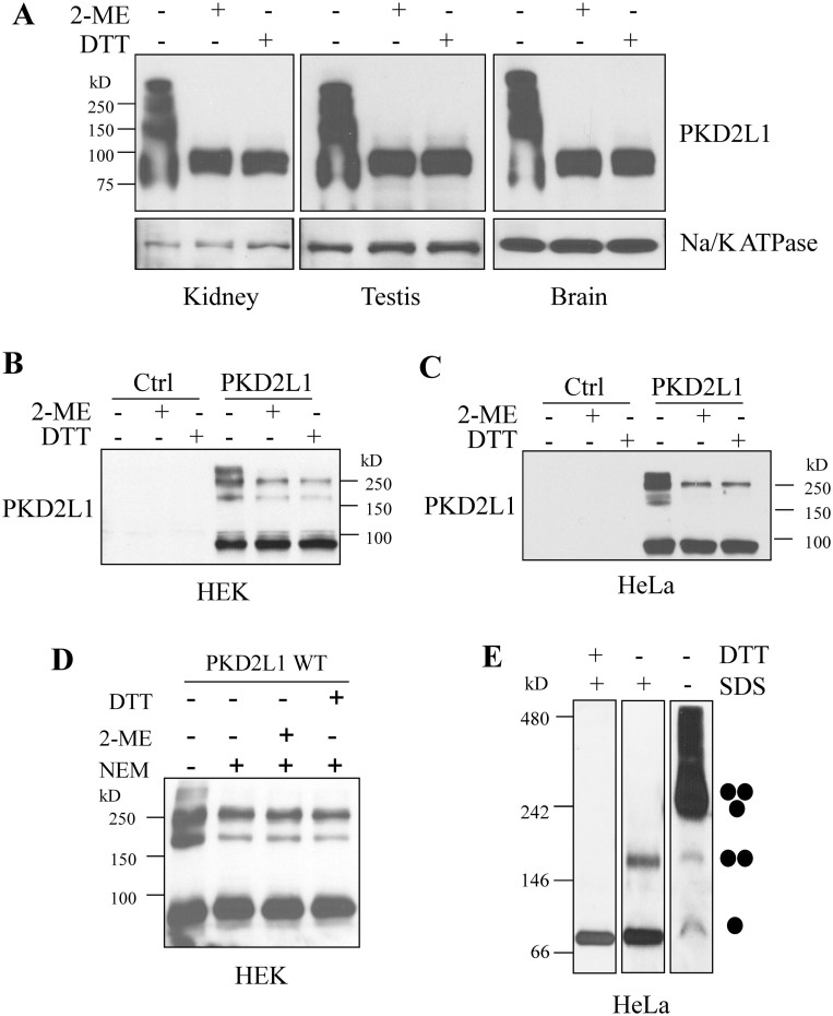 Figure 1. Oligomers of PKD2L1 in mouse tissues and human cell lines.(A) Detection of PKD2L1 in mouse kidney, testis, and brain tissues by WB. Samples were prepared with SDS loading buffer under the non-reducing and reducing (supplemented with 5% 2-ME or 0.5â M DTT) conditions. PKD2L1 was detected with an antibody from Abnova. Na/K ATPase was used as a loading control. Detection of over-expressed human PKD2L1 in HEK (B) and HeLa cells (C). pcDNA3.1(+) containing human PKD2L1 or empty vector (Ctrl) was transfected into HEK and HeLa cells. Cell lysates were collected 48â hr after transfection. Samples for SDS-PAGE were prepared under non-reducing or reducing condition. (D) Detection of over-expressed human PKD2L1 in HEK cells under non-reducing and reducing conditions. Samples were prepared with or without treatment by 10â mM NEM. (E) WB analysis after BN-PAGE of Flag-tagged PKD2L1 over-expressed in HeLa cells. Samples were prepared with or without 2.5% SDS, or with 2.5% SDS plus 0.1â M DTT. An anti-Flag antibody was used for WB detection. Putative PKD2L1 monomer, dimer and trimer are indicated.