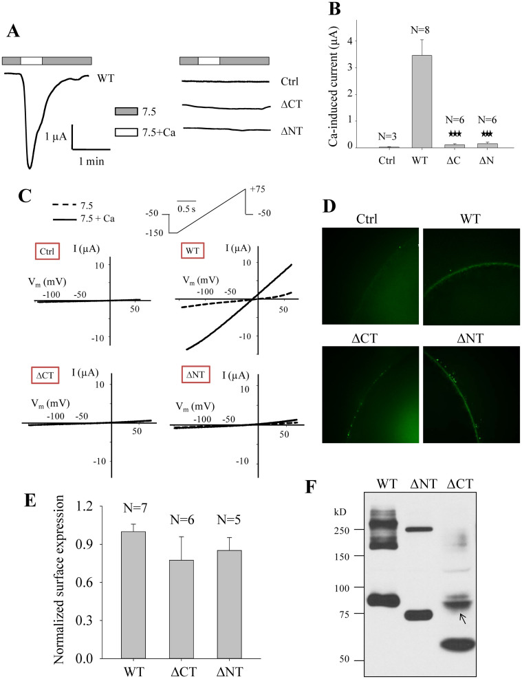 Figure 2. Roles of the human PKD2L1 N- and C-termini in its channel activity and oligomerization.(A) Representative whole-cell current tracings obtained from Xenopus oocytes expressing PKD2L1 WT, mutant δCT (deletion of E566-S805) or δNT (deletion of M1-Y96) using the two-microelectrode voltage clamp technique. Oocytes were voltage clamped at â50â mV. Data from a water-injected oocyte served as a negative control (Ctrl). Currents were measured using standard extracellular solution (pH 7.5) (7.5) or standard extracellular solution containing 5â mM CaCl2 (7.5+Ca). (B) Averaged currents obtained from oocytes expressing PKD2L1 WT, δCT, δNT or water (Ctrl). Currents were averaged from different numbers of oocytes, as indicated. â***' indicates p ⤠0.001 when compared with the WT data. (C) Representative currentâvoltage relationship curves obtained using a voltage ramp protocol, as indicated, before (7.5) and after (7.5+Ca) addition of 5â mM CaCl2. (D) Representative immunofluorescence data showing the plasma membrane expression of PKD2L1 WT, δCT and δNT in oocytes. (E) Averaged and normalized surface expression of PKD2L1 WT, δCT and δNT in oocytes. Surface expressions were averaged from indicated numbers of oocytes and normalized to that of PKD2L1 WT. (F) WB detection of Flag-tagged human PKD2L1 WT, δNT and δCT over-expressed in HeLa cells under the non-reducing condition. A band (indicated by an arrow) that is unlikely a dimer based on its size remained unaccounted for was detected with the CT deletion.