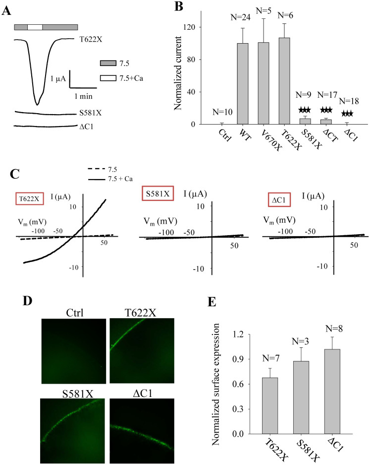 Figure 4. Identification of domain C1 of PKD2L1 critical for its channel function.(A) Representative whole-cell current tracings obtained from Xenopus oocytes expressing PKD2L1 truncation mutant T622X, S581X, or deletion mutant δC1 (C1 deletion from PKD2L1 WT) using the two-microelectrode voltage clamp technique under similar experimental conditions as those for Fig. 2. (B) Averaged currents obtained from oocytes expressing PKD2L1 WT or truncation/deletion mutants, as indicated. Currents at â50â mV were averaged from indicated numbers of oocytes and normalized to that of PKD2L1 WT. Water-injected oocytes were used as control (Ctrl). â***' indicates P ⤠0.001 when comparing with âWTâ. (C) Representative currentâvoltage relationship curves obtained using a voltage ramp protocol, as indicated in Fig. 2C, before (7.5) and after (7.5+Ca) addition of 5â mM CaCl2. (D) Representative immunofluorescence data showing the plasma membrane expression of mutants T622X, S581X and δC1 expressed in oocytes, or those injected with water (Ctrl). (E) Surface membrane expression of mutants T622X, S581X and δC1 were averaged from the indicated numbers of oocytes and normalized to that of PKD2L1 WT.