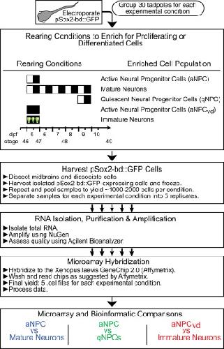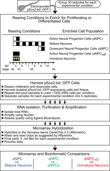 Fig. 1. Flow diagram of the protocols for animal rearing, cell isolation, RNA preparation and microarray hybridization. At stage 46 or 48, tadpoles were electroporated with a GFP-expression construct and placed in one of three visual experience conditions: normal 12 h light:12 h dark conditions; visual deprivation (vd), or enhanced visual experience. These rearing conditions produced 5 cell groups: active NPCs (aNPCs), Mature Neurons, Immature Neurons, Active NPCs isolated from visually-deprived tadpoles (aNPCvd), and quiescent NPCs (qNPCs). See text for details. GFP+ cells were harvested from dissociated midbrains and RNA was isolated and prepared for microarrays. The bottom panel shows which samples were compared by microarray analysis to identify differentially expressed genes that might be involved in cell proliferation and neurogenesis. |