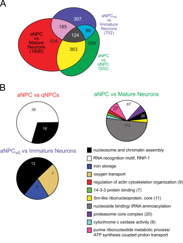 Fig. 2. Relationships between the multiple microarray comparisons. (A) Venn diagram of the overlap of the transcripts with differential expression (p<0.05) between the 3 microarray comparisons. About 50% of differentially expressed transcripts were shared between the 3 datasets. Sizes of the ovals represent the number of transcripts showing significant differential expression in each microarray comparison. The overlap represents the proportion of transcripts shared by multiple microarray comparisons. The aNPC vs Mature Neuron set contains 1606 transcripts, 672 of which were shared with at least one other group. The aNPC vs qNPC comparison has 932 differentially expressed transcripts, and shared 573 transcripts with other comparisons. The aNPCvd vs Immature Neuron comparison had 702 genes with significant differential expression, with 395 shared between the different comparisons. In total, 124 genes were shared between all 3 gene groups. (B) DAVID analyses reveal gene ontology traits from the microarray comparisons. Differentially expressed transcripts with p<0.05 from the aNPC vs qNPC, aNPC vs Immature Neuron, and aNPC vs Mature Neuron microarray comparisons were clustered using the DAVID Functional Annotation Clustering tool. The enriched gene clusters are shown in pie charts for each comparison. The number of transcripts identified in each cluster is indicated in the diagram or in the legend. Transcripts in the nucleosome and chromatin assembly pathways (black) were common to all three microarray comparisons. The RNA recognition RNP-1 family (white) was abundant in both the aNPCvd vs Immature Neuron and the aNPC vs Mature Neurons microarray comparisons. These data are provided in Supplementary Table 2. |