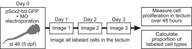 Fig. 6. In vivo time-lapse imaging protocol. We electroporated optic tecta of stage 46 tadpoles with pSox2-bd::tGFP and control morpholinos (MO) or MOs targeted against genes of interest. After 24 h, all tGFP-labeled cells in each tectal lobe were imaged at daily intervals over 3 days.Cell proliferation over 2 days and the proportions of labeled NPCs and neurons were determined for each timepoint. |