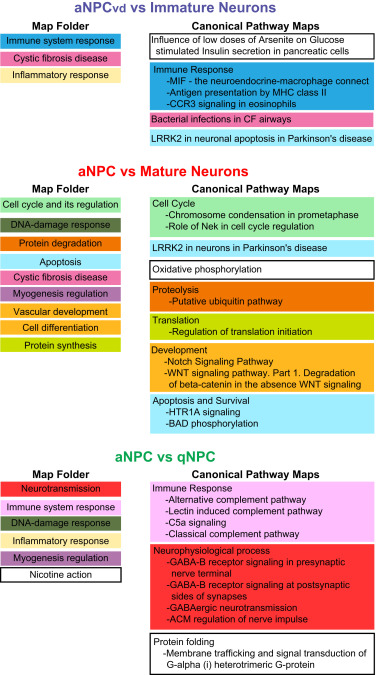 Fig. 4. MetaCore analysis of differentially expressed transcripts in NPCs and Neurons. Map Folders (left column), which identify broad functional categories, and Canonical Pathways Maps (right column), which identify more specific candidate interaction pathways, are listed in the order of significance, from top to bottom of the lists. Pathway Maps that are within Map Folders are color coded. The top 10 significant pathways from MetaCore (p<0.05 and False Discovery Rate <0.05) are presented here. Specific components of the Pathway Maps that were identified in the microarray comparisons are shown in Supplementary Table 3. |