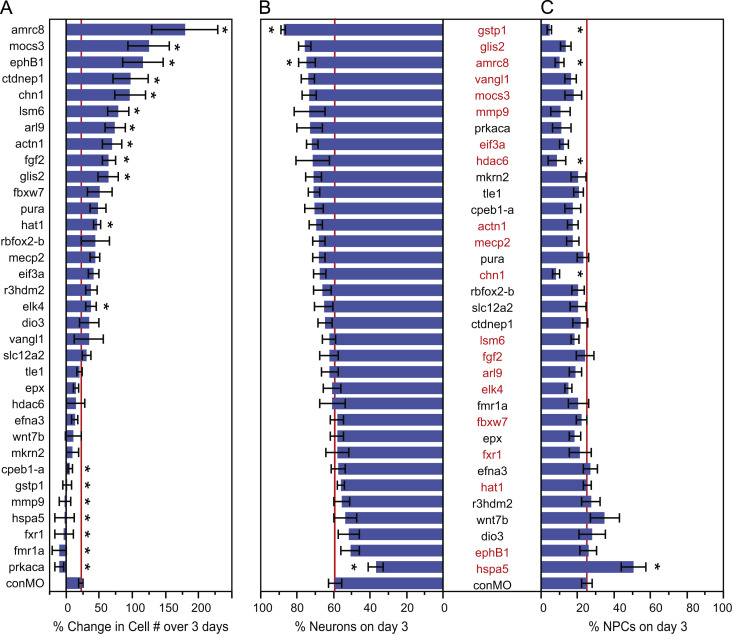 Fig. 8. Morpholinos against candidate neurogenic genes generate a range of neurogenesis phenotypes. Summary of the in vivo imaging data showing the numbers of GFP-labeled cells generated over time (A), the proportion of the cells that were neurons (B) or NPCs (C) for each experimental condition. (A) The genes targeted with morpholinos are arranged by the magnitude of the change in cell number over 3 days. The asterisks indicate a significant decrease or increase compared to control morpholino conditions (red line). The mean values, SEMs and p-values are in Table 4. (B–C) The proportion of neurons (B) and NPCs (C) as a percentage of all cells counted on day 3. The genes targeted are listed along the y-axis and arranged by those that produced the greatest proportion of neurons. Asterisks indicate differences in the proportion of cell types between the experimental and matched control morpholino groups (Mann–Whitney U test, p<0.05). Gene symbols listed in red identify the morpholinos that resulted in a significant difference in the proportions of cell types compared to control (Pearson X-square test, p<0.05). The mean values, SEMs and p-values are in Table 2. Red lines on graphs indicate the mean control morpholino (conMO) values for the proportion of neurons or NPCs. The mean values, SEMs, and p-values are in Table 5. |