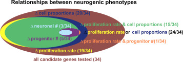 Fig. 9. Candidate gene sets defined by neurogenesis phenotypes. Categories of neurogenesis phenotypes from morpholinos are shown as colored ellipses where the area of each ellipse is proportional to the number of genes in that category. Of the 34 candidate genes (red) tested with morpholino treatment, 24 significantly altered the proportions of cell types (blue circle, Pearson's Chi-square) and 19 significantly altered the proliferation rate (yellow, MannâWhitney U test). The morpholinos against 15 candidate genes altered both the cell types generated and the proliferation rate. The overlap between these two categories is shown in green. Among these 15 genes, 5 generated significant differences in the proportions of NPCs (purple, MannâWhitney U test) and of those, 3 also had significant differences in the number of neurons that were generated (light blue, MannâWhitney U test). One of the 5 (purple) changed both proliferation rate and NPC number (peach). |