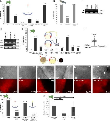 Figure 3. PAPC in tissue separation. (A and B) Quantitation of separation behavior; Xenopus (A) and zebrafish (B) mesoderm test explants on BCR/epiblast. (C and D) RT-PCR of variously injected Xenopus BCR at stage 10 to detect Xsnail1 or PAPC mRNA. TB WE, tailbud stage whole embryo. (E) Ectopic separation behavior in Xenopus BCR. Variously injected BCR test explants were placed on uninjected BCR. (F) Inferred control pathway. (G–L) Ectopic cleft formation in Xenopus BCR. One side of prospective BCR was injected with RDA, cleft was observed in incident light (arrowheads, top), and cell sorting in red fluorescence (bottom). n, number of explants. (M) Quantitation of separation behavior. (left) Xenopus mesoderm on PAPC-injected BCR; (right) M-PAPC BCR on uninjected or M-PAPC BCR. (N) Tissue surface tension of uninjected BCR or BCR expressing DN C-cadherin or M-PAPC. n, number of cell aggregates. Standard deviations are indicated. |