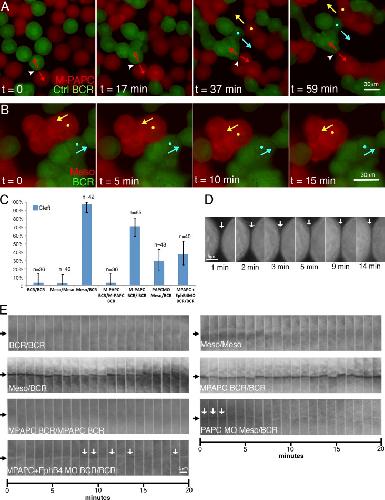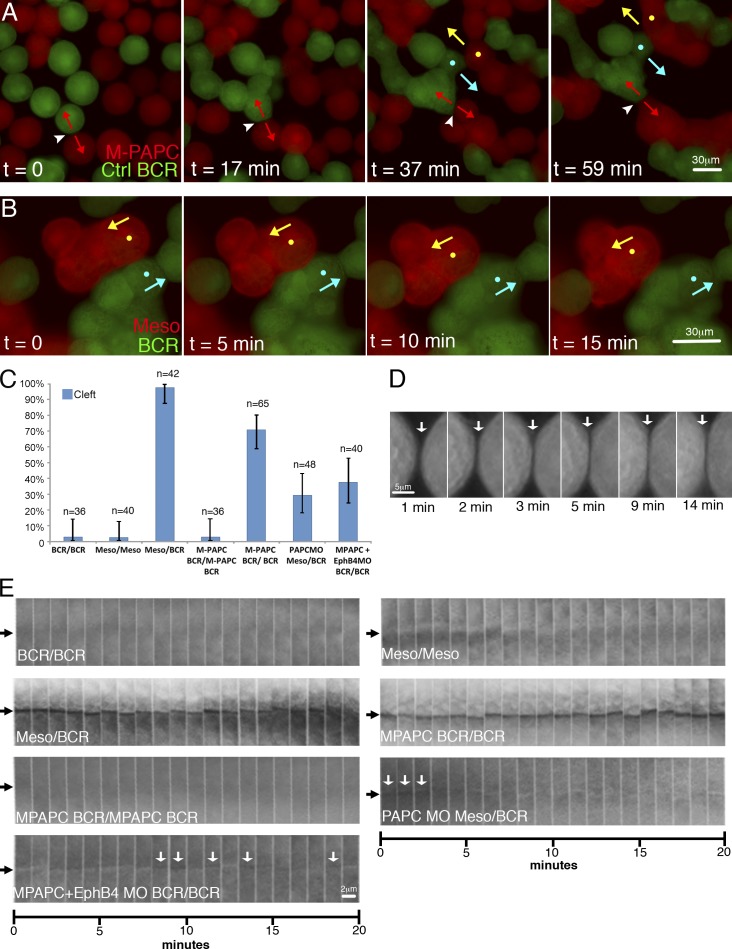 Figure 4. Cleft contact formation. (A) Reaggregation of normal (FDA labeled) and M-PAPC–expressing (RDA) BCR cells. Arrowheads indicate example of cleft contact; blue and yellow dots and arrows indicate gliding movement; cell groups move apart in the direction of the red arrows. (B) Reaggregating prechordal mesoderm (RDA) and BCR (FDA) cells. Gliding of cells marked as in A. (C) Frequency of cleft contacts after 30 min of reaggregation. 95% confidence intervals indicated; n, number of cell pairs. (D) Expansion of initial cleft contact (arrows) between reaggregating ectoderm and mesoderm cells. (E) Exemplary kymographs of cell contacts in reaggregated cells quantitated in C. Black arrows indicate the position of cell–cell contact. White or gray, close contact; dark, cleft contact (pointed out by white arrows when only occasionally present). |