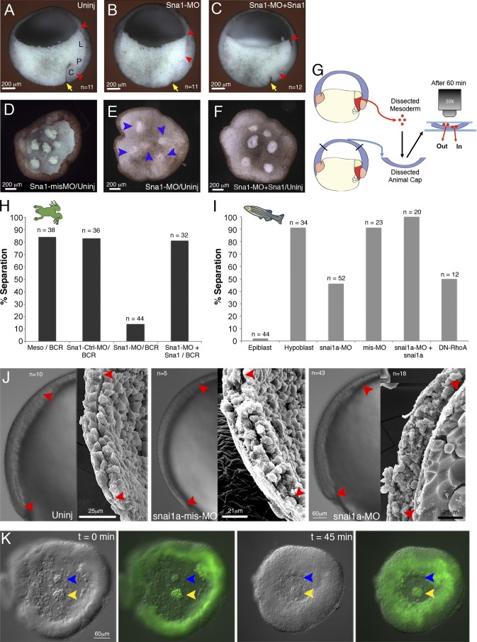 Figure 1. Snail1 function in tissue separation. (A–C) Brachet’s cleft in sagittally fractured stage 10.5 Xenopus gastrulae. Uninjected embryos (A); cleft (between red arrowheads) is shortened by Xsnail1-MO (B), but not Xsnail1-MO/Xsnail1 mRNA coinjection (C). Yellow arrows indicate the blastopore. C, chordamesoderm; P, prechordal mesoderm; L, leading edge mesendoderm; n, number of embryos. (D–F) BCR assay for separation behavior in Xenopus. Prechordal mesoderm explants injected with control Sna1-misMO (D), Xsnail1-MO (E), or Xsnail1-MO and Xsnail1 mRNA (F) are placed on explanted BCR. Explants sunken after 1 h in E are indicated by arrowheads. (G) Outline of BCR assay. (H) Quantitation of BCR assay. Y axis, percentage of test explants remaining on surface; n, number of explants. (I–K) Tissue separation in zebrafish. (I) Quantitation of separation behavior as in H. (J) Brachet’s cleft in live embryos (left panels) and SEM micrographs (right panels) at 75% epiboly in wild-type and snai1a-misMO– and snail1a MO–injected embryos. Red arrowheads indicate Brachet’s cleft; n, number of embryos. (K) In vitro assay, differential interference contrast images, and fluorescence overlay images at explanation (left) and 45 min later (right). Epiblast test explant (blue arrowheads) sinks into the epiblast, and fluorescent hypoblast explant (yellow arrowheads) remains on the surface. |