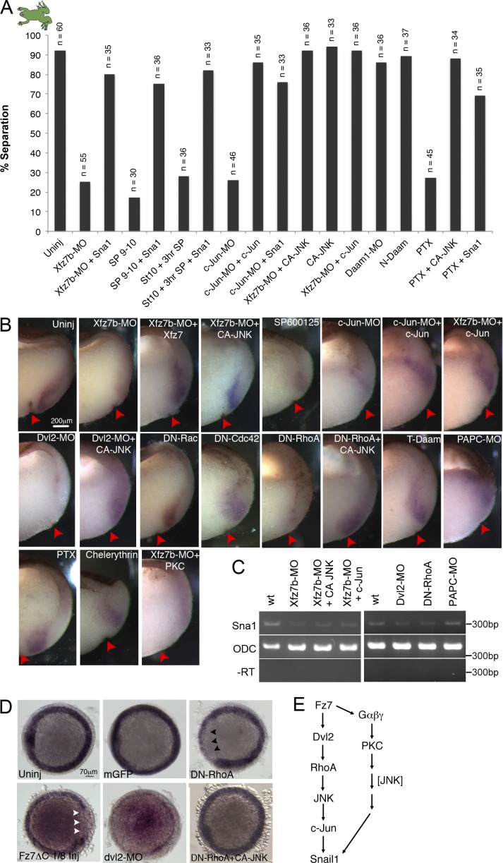 Figure 2. Xfz7 signaling regulates Xsnail1 expression and separation behavior. (A) Quantitative analysis of tissue separation as in Fig. 1 (H and I). Mesoderm was injected as indicated (symbols as in the text). (B) In situ hybridization for Xsnail1 RNA in stage 10.5 Xenopus gastrulae; dorsal halves of sagittally fractured embryos are shown. Red arrowheads indicate blastopore; differences in morphology caused by effects of treatments on gastrulation movements. (C) RT-PCR of dorsal mesoderm from stage 10.5 gastrulae to detect Xsnail1 mRNA. (D) snail1a in situ hybridization in zebrafish. Expression is normal in uninjected and mgfp RNA–injected embryos, reduced in DN-RhoA embryo (black arrowheads), and rescued in embryo coinjected with DN-RhoA and CA-JNK mRNA. Xfz7ΔC injected into one of eight blastomeres (white arrowheads) and dvl2-MO inhibit Snail1a expression. (E) Inferred pathway of Snail1 expression control by Fz7. |