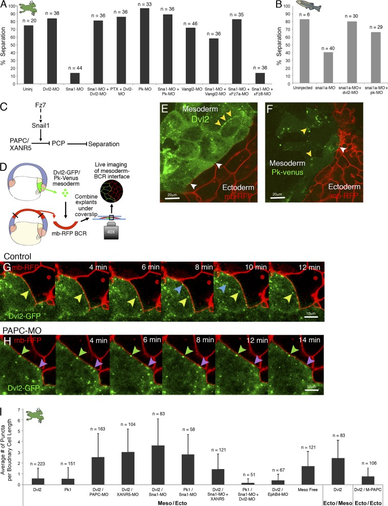 Figure 7. PAPC function beyond PCP inhibition is required for cleft formation. (A) Quantitation of separation in gain-of-function experiment. BCR was injected as indicated. (B–D) Ectopic cleft formation in the BCR, as in Fig. 3 (G–L). (E) Exemplary kymographs of cleft contact formation, as in Fig. 4 E. (F) Frequency of cleft contacts after reaggregation, as in Fig. 4 C. (G) Reduced Dvl-GFP puncta in EphB4-MO–injected mesoderm (green) at boundary to BCR (red, membrane-RFP in ectoderm). (H) Quantitation of separation behavior. (left) Mesoderm injected as indicated was tested on normal BCR. (right) BCR explants injected as indicated were tested on normal BCR. (I) Model of tissue separation at the mesoderm–ectoderm (BCR) boundary. |