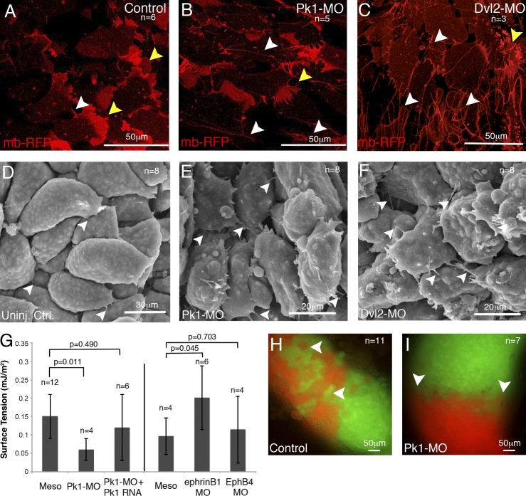Figure 6. PCP function strengthens cell adhesion. (A–C) Prechordal mesoderm explants. Frames from time-lapse recordings of membrane-RFP–labeled cells migrating over each other. White arrowheads indicate membrane tethers in Pk1-MO or Dvl2-MO explants; yellow arrowheads indicate lamellipodia. n, number of explants. (D–F) Prechordal mesoderm in SEM images of sagittally fractured gastrulae. Extensions similar to membrane tethers in A–C are frequent in Pk1-MO or Dvl2-MO embryos (arrowheads). n, number of embryos. (G) Tissue surface tension in prechordal mesoderm is decreased by Pk1-MO and increased by ephrinB1-MO. Standard deviations are indicated. n, number of aggregates from a single experiment. (H) Normal mixing (arrowheads) of left and right prechordal mesoderm cells (RDA and FDA labeled) across midline. (I) Cells respect sorting boundary (arrowheads) when Pk1-MO is injected into the RDA side. n, number of embryos. |