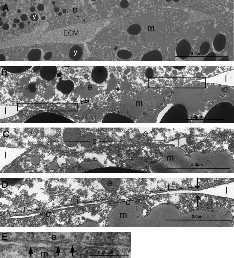 Figure 8. Ultrastructure of Brachet’s cleft. (A) Low-magnification view of Brachet’s cleft. ECM stained with LN. Note size differences of yolk platelets (y) in mesoderm versus ectoderm. (B–E) Contacts between ectoderm and mesoderm cell in absence of ECM staining. Boxes in B indicate regions shown at higher magnification in D–E. e, ectodermal BCR; m, prechordal mesoderm; l, large gaps; i, intermediate, gap-like contacts; c, close, adherens junction–like contacts. Arrows in D indicate point of divergence of membranes at end of intermediate contact and in E indicate characteristics of adherens junctions at high cadherin density. |