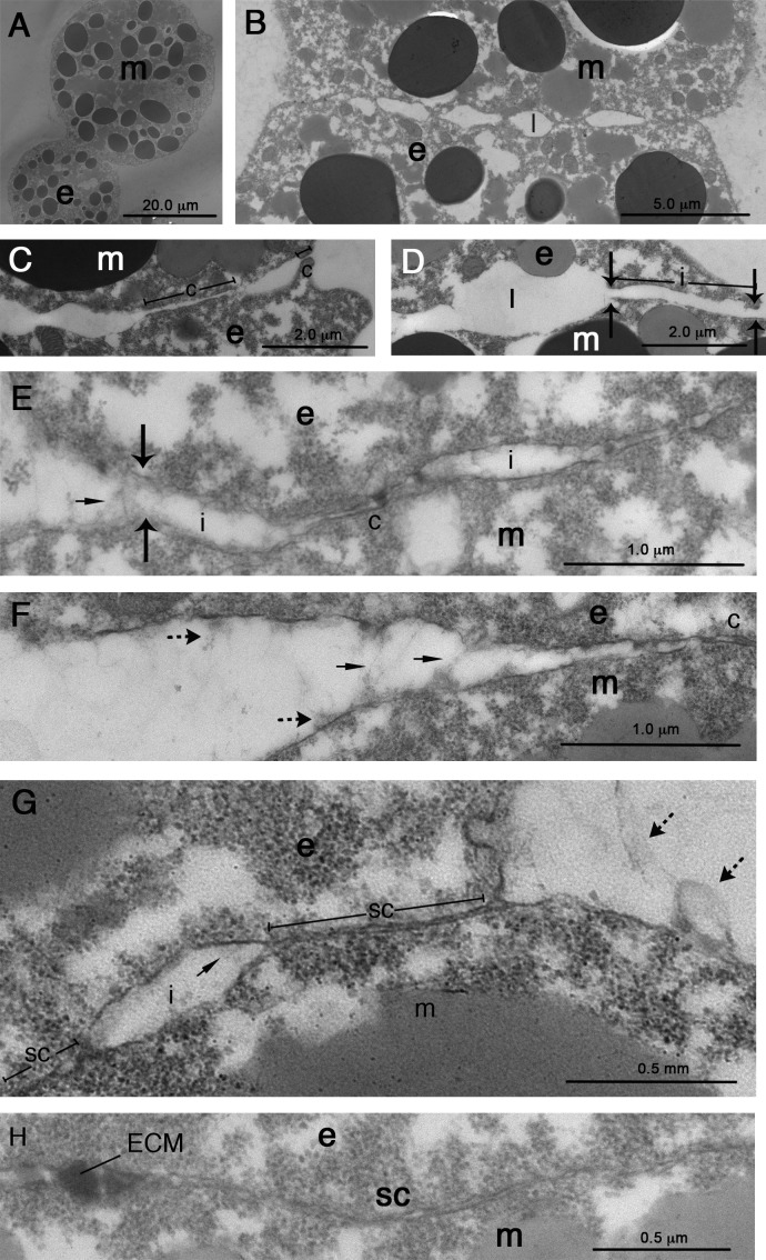 Figure 9. Ultrastructure of cleft contacts. Cells after 20 min of reaggregation. (A) Pair of mesoderm (large yolk platelets) and ectoderm cells (small platelets). (B) Alternating large gaps and narrow contacts between cells of ectodermâmesoderm pair. (C and D) High-magnification views of regions of close (C) and intermediate contacts (D), respectively, of a cell pair. (E and F) Cleft contact ECM stained with lanthanum/alcian blue. ECM stretching across gaps (small arrows) or in patches on cell surface and in large gaps (dashed arrows) is shown. (G and H) Contacts between normal ectoderm and PAPC-MOâinjected prechordal mesoderm cells, ECM stained with lanthanum/alcian blue. e, ectodermal BCR; m, prechordal mesoderm; l, large gaps; i, intermediate contacts; c, close, adherens junctionâlike contacts; sc, super-close contacts; large arrows, points of divergence of membranes at end of intermediate contacts. |