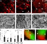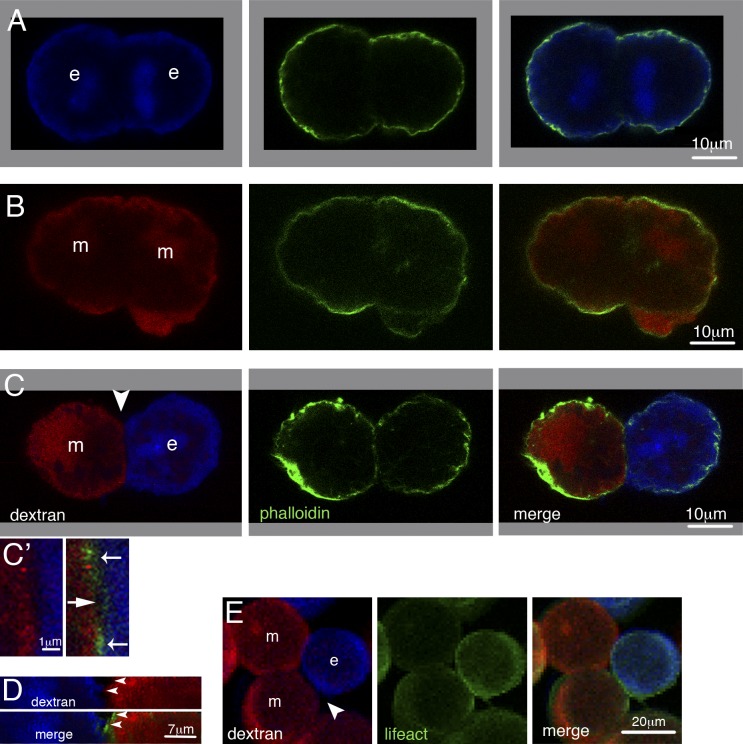 Figure 10. Actin cortex at cleft contacts. (A–C) Ectoderm–ectoderm (A), mesoderm–mesoderm (B), and ectoderm–mesoderm (C) reaggregating cells filled with cascade blue–dextran (blue; ectoderm) or RDA (red; mesoderm) and stained with fluorescein-tagged phalloidin for F-actin cortex labeling. Arrowhead in C indicates a cleft contact. (C’) High-magnification view of part of cleft contact in C; small arrows indicate gap largely covered by phalloidin staining; large arrow indicates gap remaining between cortices of adjacent cells. (D) Z stack of cleft contact; F-actin staining (bottom) is peripheral to RDA (top and bottom) boundary (arrowheads) both above cleft (top arrowheads) and in cleft (bottom arrowheads). (E) GFP-LifeAct (green) in gap (arrowhead) between living mesoderm and ectoderm cells labeled as in A–D. |