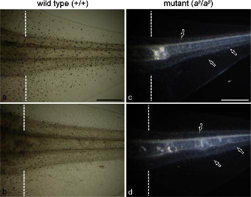 Fig. 1. Expression of pigment cells in the 6-day regenerating tail in the absence (a, c) or presence (b, d) of phenylthiourea (PTU); amputated at stage 50. a, b Wild type regenerating tail observed under transmitted light. c, d Mutant regenerating tail observed under incident light. Dashed lines indicate amputation level. Many melanophores appeared in the wild type regenerating tail in the absence of PTU (a). However, few melanophores appeared in the wild type regenerating tail in the presence of PTU (b). In contrast, white pigment cells (arrows) appeared in the mutant regenerating tail in both the absence (c) and presence (d) of PTU. Barâ500 μm