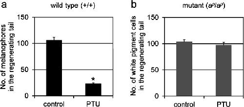 Fig. 2. Effect of PTU on the number of differentiated pigment cells in the 5-day regenerating tail of the wild type (a) and the mutant (b); amputated at stage 50. a Melanophores were counted in the wild type regenerating tail in the absence (control; nâ=â24) or presence (PTU; nâ=â21) of PTU. b White pigment cells were counted in the mutant regenerating tail in the absence (control; nâ=â18) or presence (PTU; nâ=â15) of PTU. The number of melanophores in the wild type regenerating tail in the presence of PTU was statistically different from that in the absence of PTU (t-test, *Pâ<â0.001). However, the number of white pigment cells in the mutant regenerating tail in the presence of PTU was not statistically different from that in the absence of PTU (t-test, Pâ>â0.3)