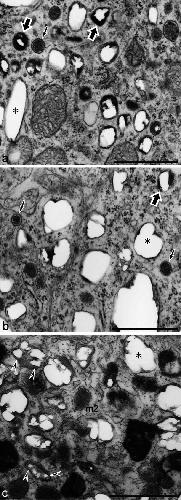 Fig. 5. Reflecting platelet organellogenesis in iridophores and white pigment cells. a, b Ultrastructure of wild type (a) and mutant (b) iridophores that were allowed to differentiate in culture. c Ultrastructure of white pigment cells in the mutant regenerating tail. Spherical vesicles with electron-dense material (a, b, small arrows) were present in both wild type and mutant iridophores. Spherical vesicles subsequently accumulated crystals that were lost partially during fixation and thin-sectioning, leaving âpartial holesâ (large arrows) in the sections. Mature reflecting platelets were characterized by âempty holesâ (asterisk). Reflecting platelets of wild type iridophores were rectangular (a, asterisk); however, those of mutant iridophores were irregular in size and shape (b, asterisk). White pigment cells in the mutant contained irregular-shaped reflecting platelets (c, asterisk) and stage II melanosomes with internal lamellar structures (m2). Note that reflecting platelets in white pigment cells were formed from stage II melanosomes (c, arrowheads), but not from spherical vesicles that were observed in iridophores (b). Barâ1 μm