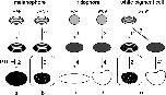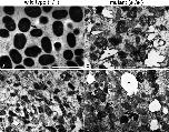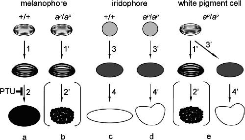 Fig. 9. Representation of pigment organellogenesis in melanophores (a, b), iridophores (c, d), and white pigment cells (e). a, b Melanosome formation in wild type (a) and mutant (b) melanophores. c, d Reflecting platelet formation in wild type (c) and mutant (d) iridophores. e Pigment organellogenesis in white pigment cells in the mutant. In wild type melanophores, melanin deposition occurs in stage II melanosomes to form partially melanized stage III melanosomes (a, 1) and then fully melanized stage IV melanosomes are formed (a, 2). Melanin is also deposited in stage II melanosomes to form stage III melanosomes (b, 1’) in mutant melanophores; however, few melanosomes become fully melanized (b, 2’). PTU inhibits melanosome maturation from stage III melanosomes to stage IV melanosomes in melanophores. In wild type iridophores, spherical vesicles with electron-dense material accumulate crystals (c, 3), which grow larger and exhibit rectangular reflecting platelets (c, 4). Crystals are also accumulated in spherical vesicles with electron-dense material in mutant iridophores (d, 3’); however, reflecting platelets become irregular in shape (d, 4’). In white pigment cells, melanosome formation (e, 1’, 2’) occurs in the same manner as described in mutant melanophores (b, 1’, 2’). In addition, some stage II melanosomes accumulate crystals in white pigment cells (e, 3’), and irregular-shaped reflecting platelets are formed (e, 4’)