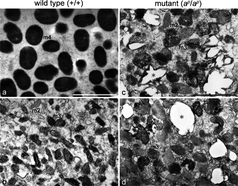 Fig. 3. Ultrastructural characteristics of pigment cells that differentiated in the 18-day regenerating tail in the absence (a, c) or presence (b, d) of PTU (amputated at stage 50). a, b Ultrastructure of melanophores in the wild type regenerating tail. c, d Ultrastructure of white pigment cells in the mutant regenerating tail. Wild type melanophores in the absence of PTU (a) were filled with stage IV melanosomes (m4), whereas melanophores in the presence of PTU (b) contained stage II melanosomes (m2) and stage III melanosomes (m3). White pigment cells in both the absence (c) and presence (d) of PTU contained irregular-shaped reflecting platelets (asterisks), stage II melanosomes (m2), and stage III melanosomes (m3). The quantitative data on pigment organelles in the absence or presence of PTU are presented in Table 1 (wild type) and Table 2 (mutant). Barâ1 μm