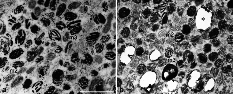 Fig. 4. Ultrastructural comparison between mutant melanophores (a) and white pigment cells (b) in culture. Mutant melanophores in culture contained stage II melanosomes (m2), stage III melanosomes (m3), and few mature melanosomes. Cultured white pigment cells in the mutant contained stage II melanosomes (m2), stage III melanosomes (m3), and irregular-shaped reflecting platelets (asterisk). Few mature melanosomes were present in white pigment cells. Bar 1 μm