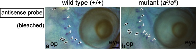 Fig. 8. Ferritin H subunit mRNA is not expressed in the eye in the wild type (a) and the mutant (b) at stage 48. WISH was performed with sense (not shown) or antisense DIG-labeled RNA probes, and tadpoles were bleached after BM purple staining (op olfactory pit). No staining was observed in the eye in either the wild type (a) or the mutant (b). In contrast, expression of the ferritin H subunit mRNA was detected in the lateral lines (arrowheads) and some epidermal cells (arrows). Barâ100 μm