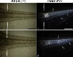 Fig. 6. Spatial expression of the ferritin H subunit mRNA in the middle region of the tail in the wild type (a, b) and the mutant (c, d) at stage 48. Whole mount in situ hybridization (WISH) was performed by using sense (a, c) or antisense (b, d) digoxigenin (DIG)-labeled RNA probes. Tadpoles were bleached to remove melanin before hybridization in this experiment. With a sense probe of the ferritin H subunit mRNA, no staining was observed in the tail of both the wild type (a) and the mutant (c) in the negative control. Use of an antisense probe in WISH detected strong staining in the lateral lines (arrowheads) of both the wild type (b) and the mutant (d). In addition, specific expression of the ferritin H subunit mRNA was detected in white pigment cells (d, large arrows), which were present around the dorsal side of the spinal cord (sc) in the mutant (nc notochord). Although melanophores were present around the dorsal side of the spinal cord in the wild type, no staining was observed in melanophores (b). Note that staining was also detected in some epidermal cells (small arrows) in both the wild type (b) and the mutant (d). Barâ100 μm