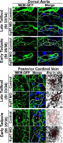 Fig 5. Cellular morphology of endothelial cells undergoing lumen formation.(A-H). Representative confocal images of transverse sections of the dorsal aorta (DA) and posterior cardinal veins (PCV) stained with GFP to mark cell membranes (MEM-GFP; green) and DAPI to mark nuclei (blue). Phase contrast images for the PCVs represent the Erg in situ signal. All images taken at 63x magnification with scale bars indicating 20 μm. Dotted white and red lines in all panels delineate individual endothelial cells. As anatomical references, the hypochord in (A-D) and the kidney in (E-H) are indicated by solid white lines. (A). Endothelial cells of the DA are oblong-shaped at late tailbud stage (stage 33/34) control embryos. (B). Endothelial cells of late tailbud stage (stage 33/34) EGFL7-depleted DAs display a similar morphology to controls. (C). Endothelial cells elongate during DA lumen formation in early tadpole stage (stage 35/36) control embryos. (D). Endothelial cells of the DA remain oblong-shaped and do not elongate to accommodate the vascular lumen in early tadpole stage (stage 35/36) EGFL7-depleted embryos. (E). Endothelial cells of the PCVs have a polygonal cobblestone-like shape in late tailbud stage (stage 33/34) control embryos. (F). Endothelial cells of late tailbud stage (stage 33/34) EGFL7-depleted PCVs are similarly shaped as controls. (G). Endothelial cells elongate, becoming narrower as PCV lumens form by early tadpole stage (stage 35/36) control embryos. (H). Endothelial cells of the PCVs retain their polygonal morphology in early tadpole stage (stage 35/36) EGFL7-depleted embryos. 3â4 embryos from each condition/stage were assessed from at least three independent injection batches at the same position along the anterior-posterior axis of the embryo. |